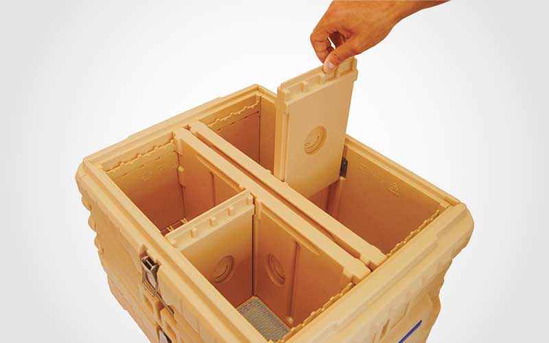 Queen Breeding Nucleus with 4 Compartments allows, by its very design, to simultaneously rear and feed four independent colonies in any region or climate. The living space available per colony not only enhances queen quality and enables her to lead a larger colony population, but also serves to increase productivity. With 4 Compartments was designed to lend itself to be converted into a Thermo Swarm Rearing Nucleus with 2 Compartments or a Thermo Production Hive, by means of accessories, if needed.